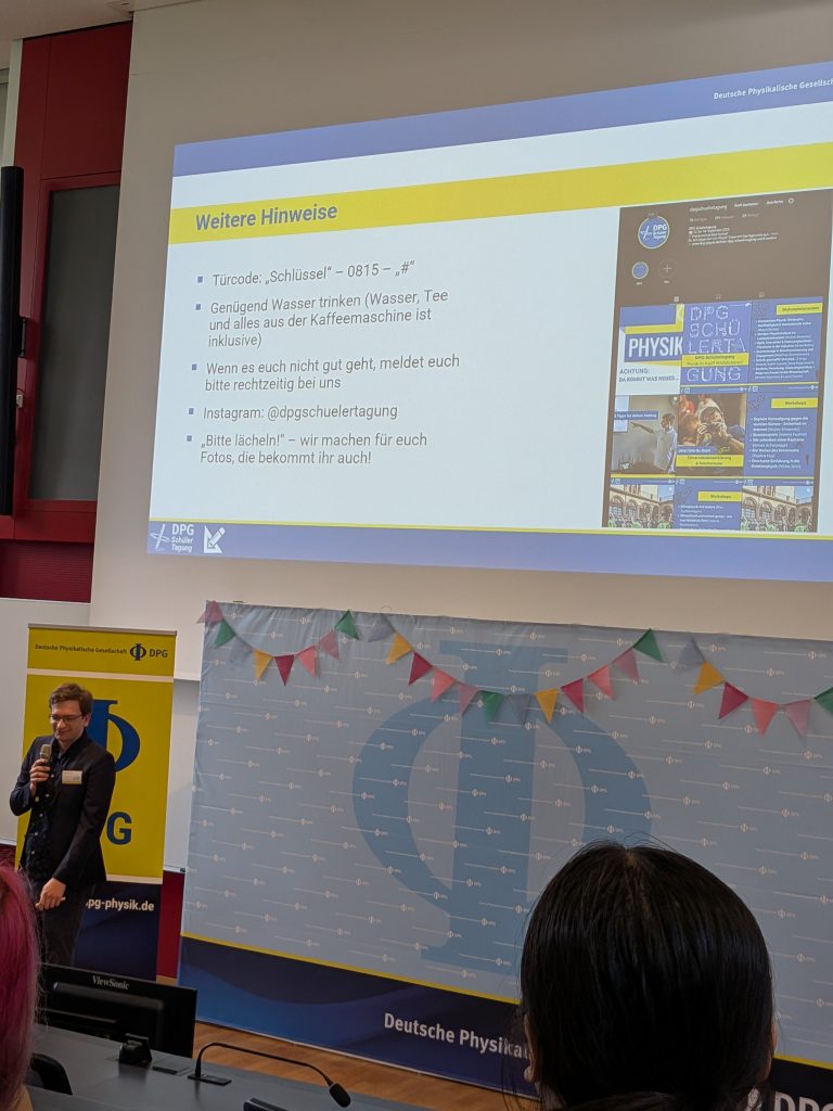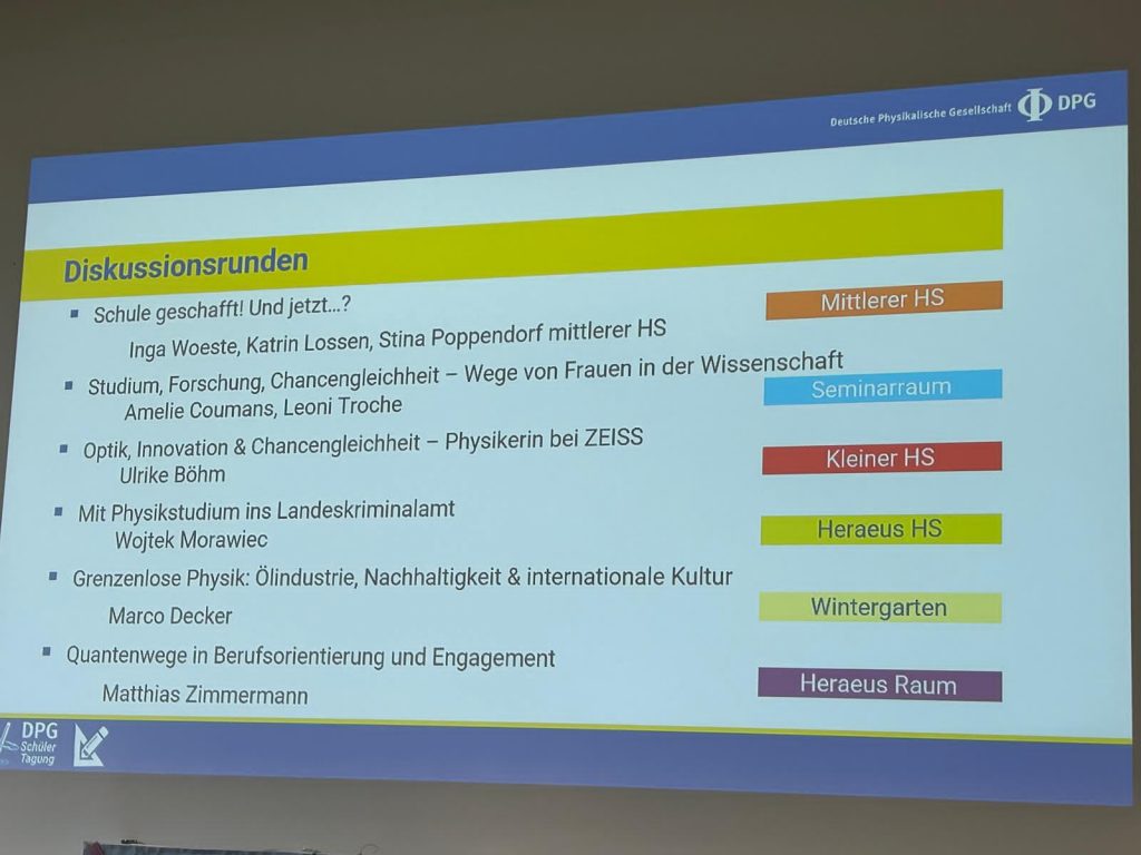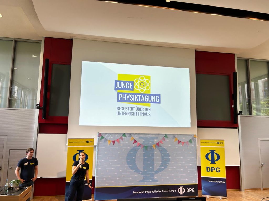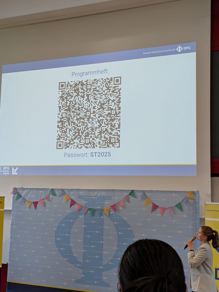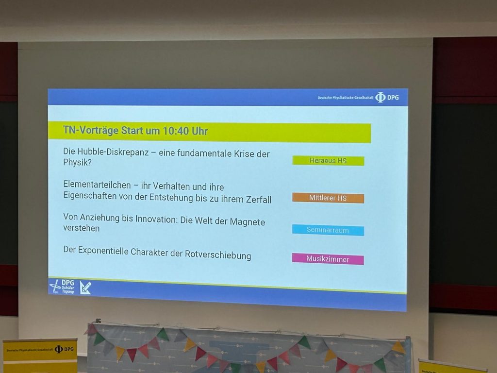 Im Verlauf der Tagung konnten wir zahlreiche spannende Vorträge hören, in denen Teilnehmende ihre eigenen Projekte vorstellten – von theoretischen Themen der Quantenphysik bis hin zu experimentellen Arbeiten in Astronomie und Technik. Darüber hinaus waren auch Expertinnen und Experten aus Wissenschaft und Forschung eingeladen, die in ihren Beiträgen Einblicke in aktuelle physikalische Fragestellungen gaben und ihre neuesten Ergebnisse präsentierten. Besonders beeindruckt hat uns, wie vielfältig und kreativ die Herangehensweisen der Vortragenden waren und mit welcher Begeisterung sie ihre Themen vermittelten.