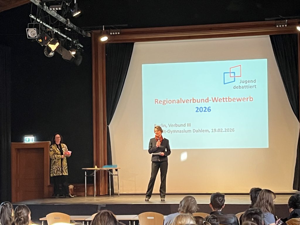 Sachlich argumentieren, aufmerksam zuhören und überzeugend reagieren: Beim Regionalwettbewerb des Berliner Verbunds III im bundesweiten Programm „Jugend debattiert“, der am 19.02.2026 am Arndt-Gymnasium Dahlem stattfand, trafen Schüler*innen von 6 Schulen des Bezirks aufeinander, um ihr rhetorisches Können unter Beweis zu stellen. Der Regionalwettbewerb ist die zweite Stufe innerhalb der mehrstufigen Wettbewerbsstruktur. Vertreten waren neben dem Arndt-Gymnasium Dahlem das Friedrich-Ebert-Gymnasium, das Goethe-Gymnasium, das Hermann-Ehlers-Gymnasium, die Bröndby-Oberschule und die Wilhelm-Ostwald-Schule. Dort hatten sich die Teilnehmenden zuvor in erfolgreichen Schulentscheiden für die nächste Runde qualifiziert.